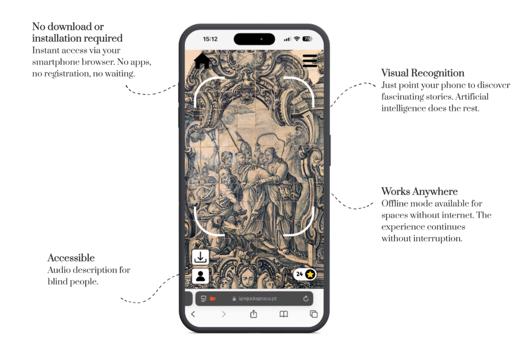 Audio and text content on the architecture, history and artistic decoration of all areas open to visitors at the Church and Convent of Graça, including the viewpoint and bell tower.